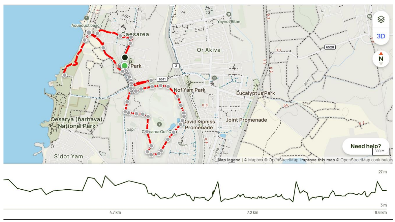 בסיום ההקפה חוזרים על הטיילת לכיוון צפון, ובכיכר הראשונה פונים שמאלה וחוצים את הכביש לכיוון חוף הקשתות. לפני החוף פונים שמאלה לשביל ישראל ורצים על המצוק עד לנמל קיסריה וחוזרים חזרה לחוף הקשתות.משם על הטיילת פונים שמאלה לשביל מהמם שמגיע עד מגרשי הטניס.שם חוצים את הכביש בחזרה ופונים ימינה בחזרה לנקודת הסיום.